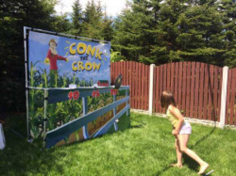 Conk the CrowFrame Game:Conk the Crow1 A colourful and sturdy 7’x7′ frame game is perfect for the little ones! Kids love to throw the bean bags and knock down the crows sitting on the farmer’s fence.